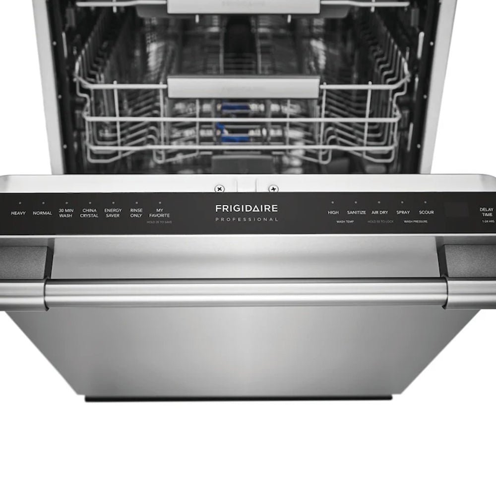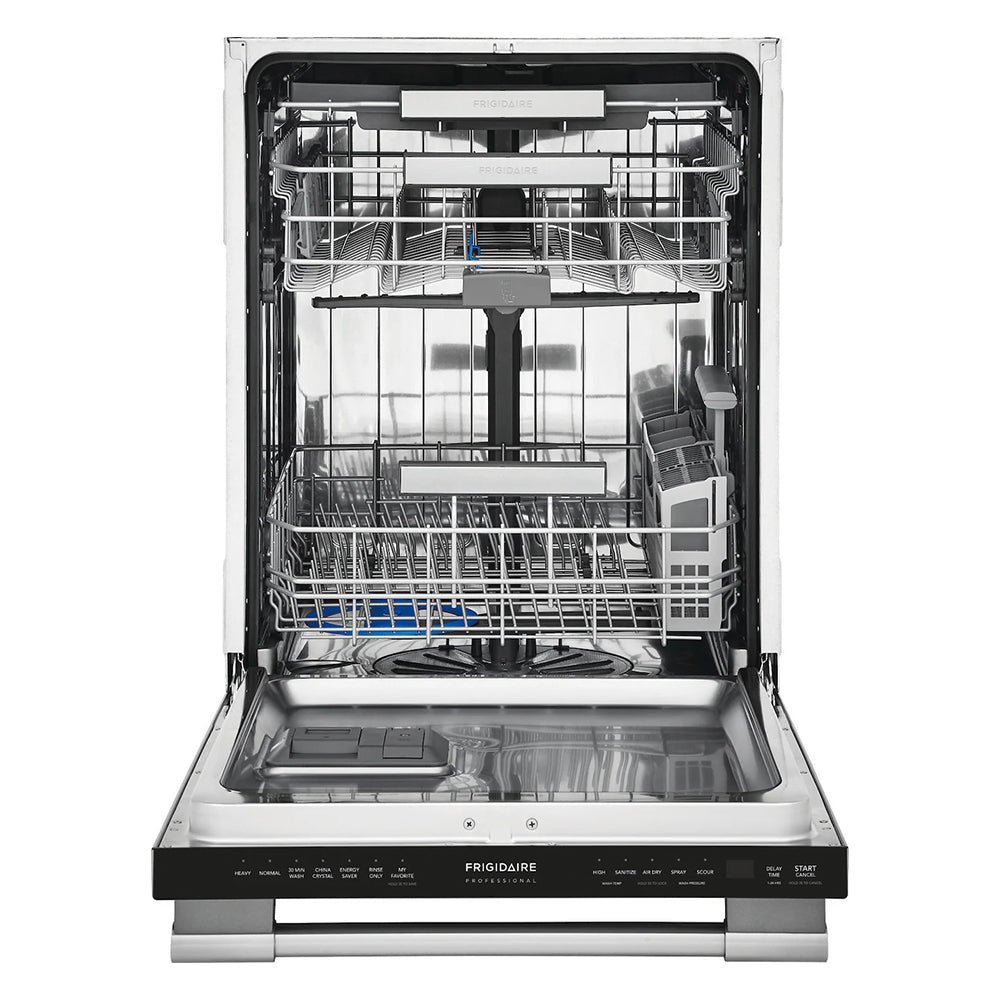The Frigidaire Professional 24″ built-in dishwasher with EvenDry system where dishes come out remarkably dry every time. Experience the ultimate flexibility of the SpacePro Organization System. The third rack offers easy access and fits small cooking utensils, while the second rack adjusts to fit tall pots and pans.