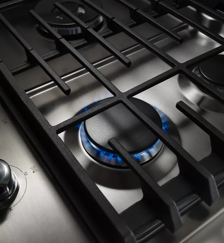 This cooktop also includes a dedicated simmer burner for delicate sauces, electronic ignition with flame-sensing re-ignition for safety, and front-mounted metal control knobs for convenience and style.